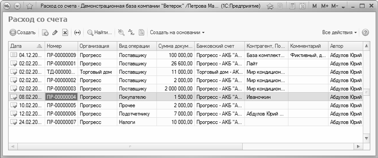 Для перехода в режим работы с этими документами щелкните в панели навигации раздела Денежные средства на ссылке Расход со счета – в результате откроется перечень сформированных ранее расходных документов (рис. 7.18).