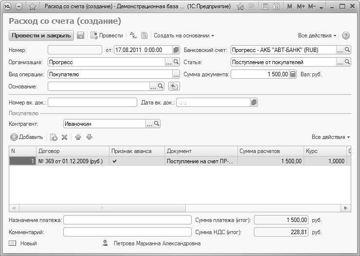 Процесс ввода и редактирования этого документа во многом аналогичен расходному кассовому документу ( см. урок 60 "Расход наличных денежных средств" ранее в этой главе ), поэтому подробно на нем останавливаться мы не будем. Отметим лишь, что в данном окне вместо поля Касса находится параметр Банковский счет – в нем указывается банковский счет организации-плательщика, с которого перечисляются денежные средства.