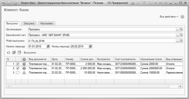 В табличной части окна формируется список документов, которые должны быть экспортированы в программу типа "Банк – Клиент". Документы в этот перечень включаются автоматически на основании выполненных настроек экспорта (интервал времени, название организации и счета). Для каждой позиции списка в соответствующих колонках отображается порядковый номер позиции, признак ее выгрузки (флажок), дата формирования и порядковый номер в конфигурации, сумма по документу, название и счет контрагента, а также назначение платежа и вид операции.