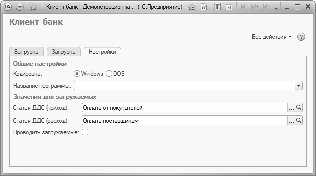 На данной вкладке с помощью соответствующего переключателя задается вариант кодировки (Windows или DOS), а также из раскрывающегося списка выбирается название программы типа "Банк – Клиент", используемой для обмена данными с банком.