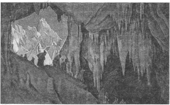 В общем-то в любой точке земли можно отыскать проходы в Подземное царство. Некогда туда переселились потомки гиперборейцев, не пожелавшие расставаться с древней прародиной только потому, что на Севере изменился климат. Можно было мигрировать на юг в поисках подходящих условий ДЛЯ ЖИЗНИ,НО МОЖНО было И остаться, укрывшись в глубоких подземных убежищах, согреваемых жаром земных недр. Рерих вспомнил, как поразила его в детстве впервые услышанная легенда о «подземной чуди» — древнем народе, который неожиданно ушел под землю. Уже тогда он постоянно задавал себе один и тот же вопрос: почему же он ушел? Теперь он знал на него ответ. Эта тема будет сопровождать его всю жизнь и получит отражение в двух картинах: одной — ранней, которая так и называлась «Чудь под землю ушла», другой — более поздней — под названием «Чудь подземная» (рис. 16), изобразив на них огромный разлом в земле, иуда спускаются пращуры северных народов и всего мира.