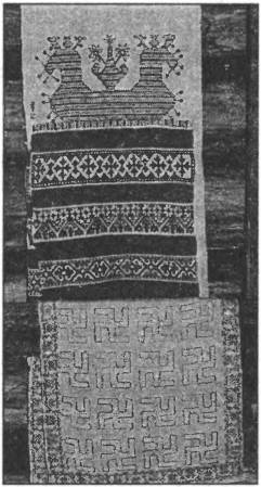 Свастика-коловорот — один из древнейших традиционных символов северного орнамента, где он олицетворял кажущееся вращение звезд в зените полярного неба. У саамов свастика жива и поныне: ее рисуют и вышивают даже дети. Одна из самых образцовых этнографических книг «Русские лопари», изданная в 1890 году Николаем Николаевичем Харузиным (1865–1900), вышла со свастикой на обложке. Еще во время первой научно-поисковой экспедиции «Гиперборея» мне подарили бесхитростное саамское украшение: в красном матерчатом ромбе черным бисером была вышита древняя свастика; на обратной стороне указан автор — ученица 2-го класса Ловозерской школы Маша Данилова (такие сувениры как изделия народного промысла свободно продаются в районах компактного проживания саамов, или саами, как их принято теперь называть). Свастиковые вышивки были испокон веков распространены также среди русского населения (рис. 33): их и сегодня можно увидеть в отделе народного искусства Государственного Русского музея в Санкт-Петербурге (рис. 34). В северных регионах России (и в частности, на Вологодчине) свастику называли ярга [60] .