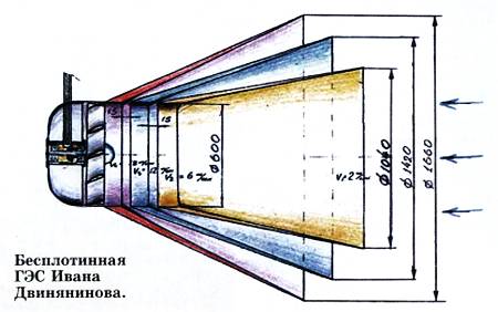 «Если учесть, что вода несжимаема, — пишет Иван, — то скорость ее в трубе возрастет в 9 раз, а мощность турбины соответственно в 81 раз». Здесь следует внести некоторое уточнение. Судя по чертежу, так не получится. Отношение площадей первой воронки равно трем. Но входные и выходные сечения второй и третьей воронки имеют форму кольца. Соотношение площадей на входе и выходе у них очень велико — 71 и 26 соответственно. Здесь должно начаться образование вихрей, резко возрасти сопротивление.