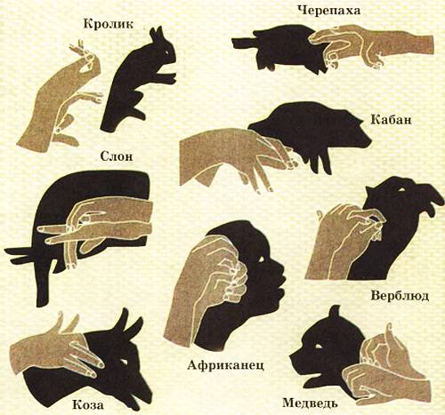 В дальнейшем вы можете использовать в теневом театре и специальные куклы-марионетки, которые вырезают опять-таки из картона с подвижно закрепленными руками, ногами и другими частями тела. Управляют ими обычно с помощью проволочек или тростинок, уходящих вниз. Стало быть, сам актер должен находиться ниже экрана, с таким расчетом, чтобы его голова не отбрасывала тени (если это, конечно, не нужно по ходу спектакля).