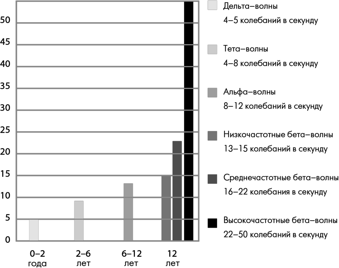 Рис. 8Б. Изменение частоты мозговых волн от дельта (в младенчестве) до бета (во взрослом возрасте). Обратите внимание на промежуточные диапазоны бета-волн: высокочастотные бета-волны вдвое быстрее среднечастотных.
