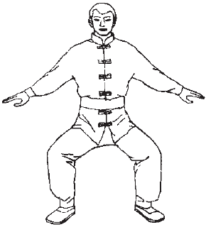 Расставить ноги приблизительно в два раза шире ширины плеч, стопы параллельны друг другу, носками направлены вперед и плотно стоят на полу. Мысленно провести прямую линию между стопами от центра одной стопы к другой (это центральная линия всех стоек). Садимся так, чтобы центр тяжести был четко на этой линии, бедра параллельны полу, колени разведены наружу, таз немного подан вперед. Кисти сжаты в кулаки и прижаты к поясу (в районе тазовых косточек), локти направлены четко назад или руки сводятся ладонями перед грудью. Спина прямая (перпендикулярна полу), макушка головы немного приподнята вверх, подбородок немного опущен вниз, плечи опущены вниз. Взгляд обращен четко перед собой.