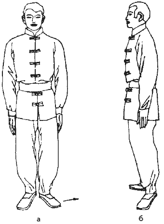 Ладони разведены в стороны, пальцы расслаблены, вытянуты; руки ниже уровня плеч, мысль сосредоточена на точках лао гун на руках, голова и туловище прямые, дух спокоен, затылок напряжен, подбородок подобран, язык упирается в верхнюю челюсть, взгляд опущен (рис. 9).