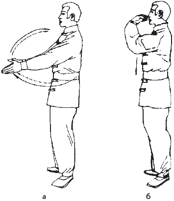 Выполняем движение следующим образом: руки поднимаем перед собой (рис. 11, а). Во время подъема вдыхаем через ноздри, одновременно сосредоточивая мысль на точке шань-ян, расположенной на кончике указательного пальца.