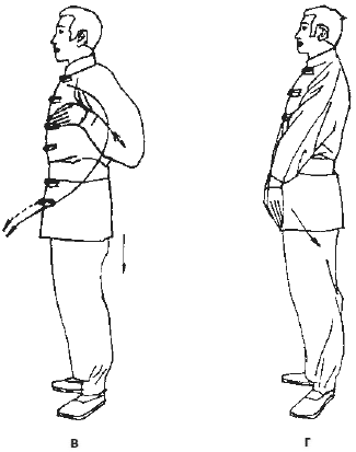 Методика выполнения: встать прямо, ноги на ширине плеч (рис. 13, а). Совершая руками вращение вовнутрь (рис. 13, б, в), дойти до положения перед грудью – пасти тигров обращены друг к другу (рис. 13, г).