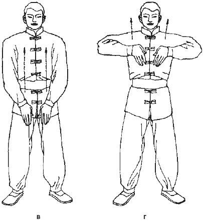 Подняв руки выше уровня плеч, смотрим на кончики указательных пальцев (рис. 11, б), потом круговым движением подводим руки к груди (рис. 11, в). Ладони, прижимаясь к груди, скользят вниз (рис. 11, г), внимание при этом сосредоточено на точке ши-сюань, одновременно выдыхаем через нос.