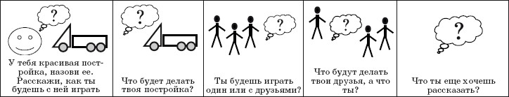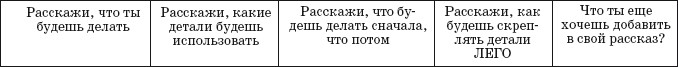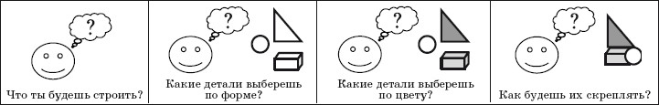 Для более успешной работы детям можно предложить схемы, составленные на основе наглядного моделирования, при помощи которых они будут строить свой рассказ. Схемы хорошо воспринимаются и легко запоминаются. Педагогу необходимо поощрять элементы фантазии, которые дети вносят в свой рассказ, обращать на них внимание других детей, тем самым способствуя их речевой активности и воображению. (Примерные схемы для составления рассказа о будущей постройке приведены на с. 36). Объясняя схему, педагог последовательно рассказывает, что нарисовано в каждом квадратике.