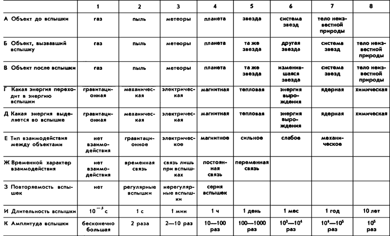 Однако вернемся к расследованию гибели звезд. Построим морфологический ящик «Вспышки в космосе». Ящик перед входом в теорию, то есть ящик, позволяющий делать верные интерпретации уже обнаруженного явления, позволяющий делать научные изобретения. Вертикальная ось — характеристика явления. Горизонтальная — возможные варианты характеристик.