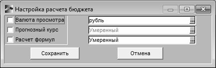 Отметим, что на вкладке бюджет изменить значения параметров Валюта, Прогнозный курс и Расчет формул вы не сможете – для этого нужно перейти в соответствующий режим нажатием кнопки Настройка. При этом открывается окно, которое представлено на рис. 3.49.