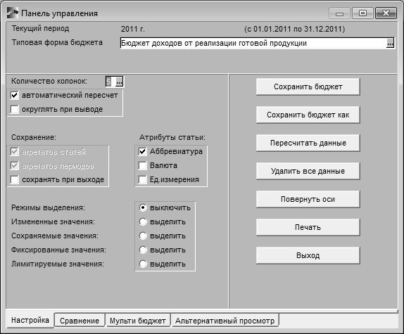 Содержимое левой части окна в зависимости от назначения и функциональности сгруппировано на вкладках Настройка, Сравнение, Мультибюджет и Альтернативный просмотр, описание которых приводится далее.