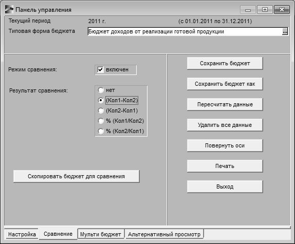 Первое, что нужно сделать для сравнения бюджетов – это включить соответствующий режим с помощью параметра Режим сравнения – включен. Только после этого вкладка примет вид, как показано на рис. 3.51, а в окне редактирования бюджета, помимо вкладки Бюджет (см. рис. 3.48), появится также вкладка Сравнить с.