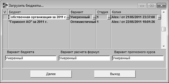 В данном окне показан список выбранных для агрегирования бюджетов. Для каждой позиции списка в соответствующих колонках отображается наименование варианта и копии варианта бюджета. После нажатия в данном окне кнопки Далее на экране открывается окно, изображенное на рис. 3.53.