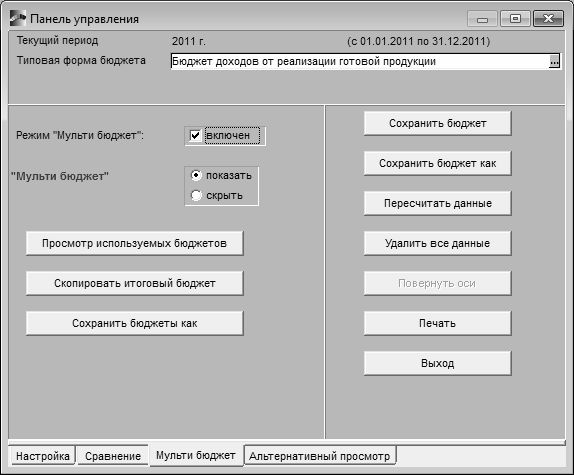 Функциональные возможности панели управления предусматривают решение следующих задач: проведение расчетов в бюджете, сравнение бюджетов, ручное агрегирование бюджетов в режиме «мультибюджет» и просмотр бюджетов с учетом внутренних или внешних оборотов в режиме «альтернативный просмотр».