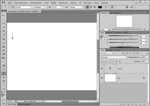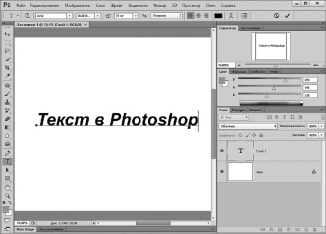 Наберем какую-нибудь фразу. Пусть это будет надпись черного цвета: «Текст в Photoshop», сделанная гарнитурой Arial , стилем Bold Italic (полужирный курсив), размером шрифта 72 пункта, выровненная по левому краю и сглаженная с помощью параметра сглаживания Плавное . После того, как надпись набрана, переместим курсор чуть ниже надписи – он превратится в подобие инструмента для перемещения слоев – и переместим надпись к центру документа (рис. 2.30.).