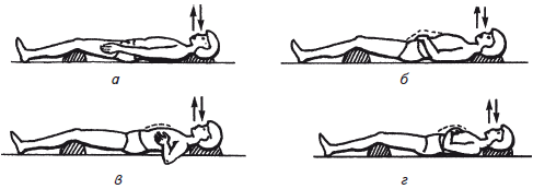 1. Исходное положение (и.п.) – лежа на спине на полу или кровати. Под головой – небольшая подушка. Колени слегка согнуты, под коленями – валик (свернутое полотенце); глаза закрыты. Начинайте глубоко дышать в обычном ритме. Вдох делайте через нос, а выдох – через рот. Щеки не надувайте. Выдох должен быть более продолжительным, чем вдох: на счет «раз» – вдох, на счет «два, три, четыре» – выдох (рис. 33, а).