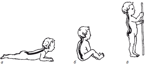 У новорожденного позвоночный столб почти прямой, изгибы его едва намечены. Когда ребенок начинает держать головку, образуется изгиб в области шеи. Поскольку большая часть головы расположена спереди от проекции позвоночника, то голова стремится опуститься вниз, и для удержания ее в поднятом положении позвоночный столб изгибается вперед, формируя шейный лордоз (изгиб кпереди) (рис. 5, а). Затем, когда ребенок начинает сидеть, усиливается грудной кифоз (изгиб кзади) (рис. 5, б). А когда ребенок учится стоять и ходить, образуется главный изгиб – поясничный лордоз (рис. 5, в). При его формировании происходит наклон таза, с которым связаны ноги. Поэтому позвоночный столб, чтобы остаться в вертикальном положении, изгибается в поясничном отделе, центр тяжести перемещается кзади, этим предупреждается уклон туловища кпереди. Появление двух лордозов обуславливает развитие двух кифозов – грудного и крестцово-копчикового, что поддерживает равновесие при вертикальном положении тела. Окончательное формирование физиологических изгибов позвоночника заканчивается в 15—16-летнем возрасте.