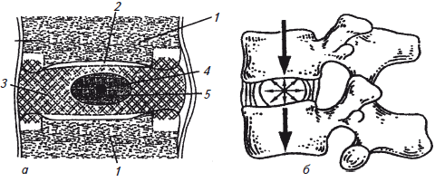 Рис. 6. Межпозвонковый диск: а – схема строения: 1 – тело позвонка; 2 – пограничная пластинка; 3 – фиброзное кольцо; 4 – центральная часть ядра; 5 – пульпозное ядро; б – распределение сил внутри межпозвонкового диска