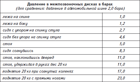 В процессе нашей жизни межпозвонковый диск выдерживает очень большие нагрузки. Величина нагрузки на позвоночник определяется положением тела. Наименьшая – когда человек лежит. В положении стоя она возрастает в 2,5 раза. При наклоне тела вперед в 10 раз (по сравнению с положением лежа). А когда человек поднимает предмет, наклонившись вперед с выпрямленными ногами, она резко увеличивается и составляет несколько сотен килограммов. Например, если человек поднимает груз весом 40 кг, то на позвоночник (а именно на межпозвонковый диск) действует сила 360 кг. Деформация межпозвонкового диска наступает при силе сжатия примерно 950 кг. Давление в межпозвоночных дисках в барах представлено в таблице 1.