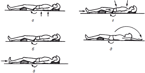20. И.п. – лежа на спине, ноги согнуты в коленях, кисть правой руки лежит на левом колене, левая рука – вдоль туловища. Упираясь в колено правой рукой, не давать левой ноге приблизиться к груди. Делать упражнение с усилием в течение 10 с (рис. 37, е). Затем переменить позу в исходном положении так, чтобы левая рука упиралась в правое колено.
