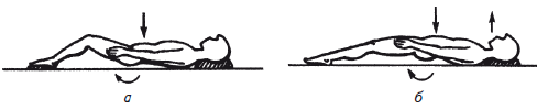 13. И.п. – лежа на спине, под головой, подушка, ноги слегка согнуты в коленях, стопы стоят свободно на полу или поверх свернутого одеяла. Сделайте вдох, а на выдохе напрягите брюшные мышцы, втяните живот, прижимая поясничную область к полу. Теперь (сохраняя давление на позвоночник) сильно сожмите и слегка приподнимите ягодицы (рис. 36, а). Таким образом вы «наклонили» таз, приподнимая вверх его переднюю часть.