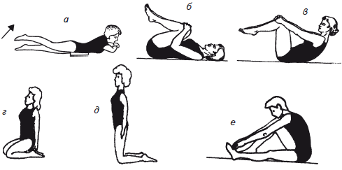 21. И.п. – лежа на спине, ноги слегка согнуты в коленях, стопы носками цепляются за какой-либо предмет (рис. 37, ж). На выдохе медленно сесть и так же медленно на вдохе вернуться в исходное положение.