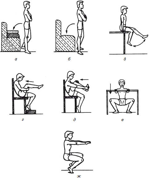 41. И.п. – стоя, руками держитесь за спинку стула или за перекладину гимнастической стенки, ноги на ширине плеч. Разведите колени в стороны, напрягите мышцы живота и ягодиц, согните ноги в коленных суставах. Медленно садитесь так, чтобы спина оставалась прямой (рис. 42, е). (Вначале присаживайтесь не ниже, чем на глубину сиденья кресла; к этому вы уже подготовлены предыдущими упражнениями.) Затем медленно поднимайтесь, держа ягодицы напряженными.
