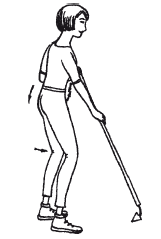 2) Одна ступня впереди другой, ноги слегка согнуты, ягодицы напряжены, спина прямая (поясничный изгиб уплощен).