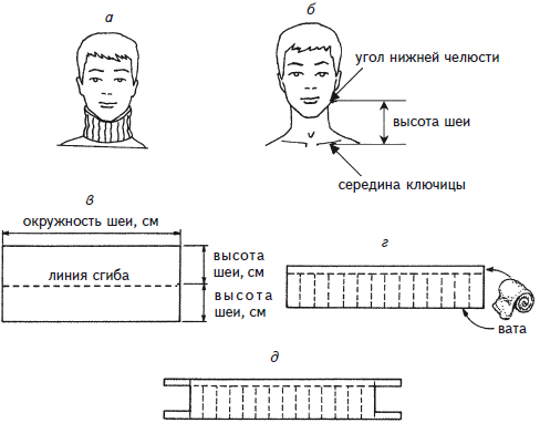 Для его изготовления вам необходимо измерить сантиметровой лентой окружность шеи и высоту шеи, которая определяется от угла нижней челюсти до середины ключицы (рис. 58, б).