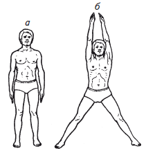 Техника исполнения. Сделайте резкий неглубокий вдох через нос. Одновременно резко поднимите через стороны вверх обе руки (тыльные стороны кистей сближаются, но не касаются друг друга), а ноги прыжком расставьте как можно шире и выпрямите их в коленях (рис. 61, б). Не останавливаясь в этом положении, опять прыжком вернитесь в исходное положение, одновременно сделав резкий неглубокий выдох через нос, опустив руки, не касаясь ладонями бедер. Движения рук и ног делаются синхронно с дыханием: на вдохе – руки поднимаются вверх, ноги в стороны; на выдохе – руки опускаются вниз и ноги возвращаются в исходное положение. Эти движения считаются за один раз.