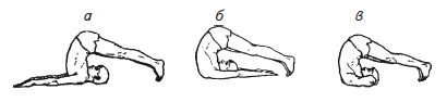 Техника исполнения. Сначала сделайте медленный и спокойный вдох через нос. Одновременно с началом медленного и спокойного выдоха через нос медленно поднимите обе ноги вверх и, опираясь на ладони рук, занесите их за голову, минуя вертикальное положение, и коснитесь пальцами ног коврика за головой. Момент касания коврика должен совпадать с окончанием выдоха. Подбородок должен упираться в яремную впадину. Оставайтесь в этом положении (рис. 63, а) на паузе после выдоха, полностью расслабившись и сосредоточив внимание на полости живота. Почувствовав, что больше задерживать дыхание вы не можете, одновременно с медленным, спокойным, неглубоким вдохом опустите на коврик туловище, потом ноги. Упражнение выполняется один раз очень плавно, без резких движений.