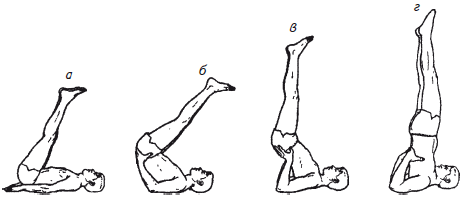 Техника исполнения. Медленно поднимите обе ноги до вертикального положения, при необходимости опирайтесь на ладони рук. Потом переведите их в направлении к голове так, чтобы они образовали с вертикалью угол примерно в 45 ° (рис. 64, а). В это время ягодицы начнут отрываться от коврика. Постарайтесь приподнять нижнюю часть туловища и перехватить расставленными пальцами рук ягодицы (рис. 64, б). Найдите для локтей удобное положение, чтобы не быт зажат локтевой нерв, и попробуйте вернуть ноги в вертикальное положение по отношению к полу (рис. 64, в). Продолжайте поднимать туловище вверх, поддерживая корпус за спину руками. Чем ближе будут руки к лопаткам, тем лучше. Подбородок упирается в яремную впадину, носки ног тяните вверх. Тело должно принять перпендикулярное к земле положение. Оставайтесь в такой позе (рис. 64, г), сосредоточив внимание на области щитовидной железы, расслабьтесь, смотрите прямо вверх. Дыхание произвольное, медленное, неглубокое, через нос. Первые 10 дней асану выдерживайте в течение 10 с. Каждые 10 дней прибавляйте по 10 с, пока не достигните 200 с. Это максимум. Упражнение выполняется только один раз.