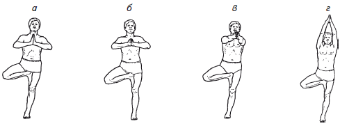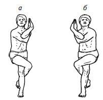 Исходное положение. Упражнение выполняется стоя. Ступня правой ноги кладется на внутреннюю сторону бедра левой ноги, пяткой к паху, а пальцами вниз. Или ступня левой ноги кладется на внутреннюю сторону бедра правой ноги, пяткой к паху, а пальцы вниз.