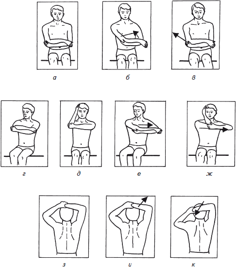 15. И.п. – сидя или стоя (лучше под горячим душем). Больная рука поднята, насколько это возможно, согнута в локтевом суставе, кисть ее заведена за голову. Здоровая рука захватывает запястье больной и тянет в свою сторону до ощущения легкой растяжки (рис. 69, з).