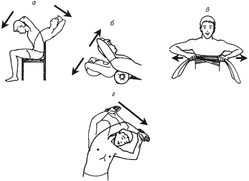 3. И.п. – сидя на стуле или лежа на спине. Обернуть длинным полотенцем или куском материи нижнюю часть грудной клетки. Взяться руками за свободные концы. Сделать глубокий вдох. При выходе максимально стянуть полотенце, способствуя тем самым более полному выдоху. Снова сделать вдох, ослабив при этом натяжение полотенца (рис. 72, в). Повторить упражнение 5—10 раз.