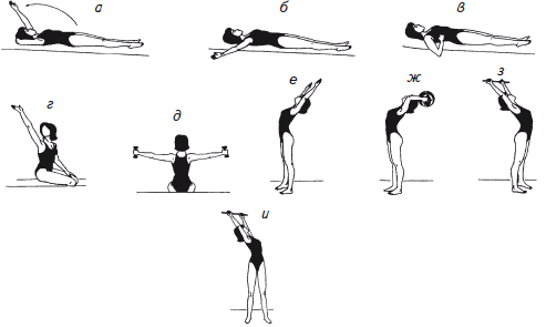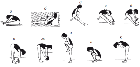 17. Ноги вытянуты, в руках гантели весом не более 2 кг, на выдохе максимальные наклоны туловища вперед (рис. 74, д).
