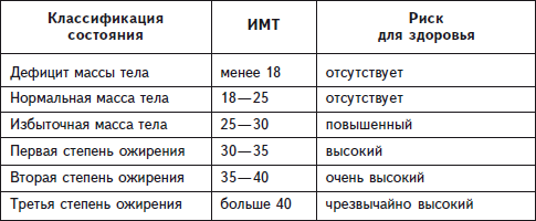 Нормальную и избыточную массы тела, а также степень ожирения оценивают по индексу массы тела (ИМТ) (табл. 4), который определяется как частное от деления величины веса на величину роста в квадрате: