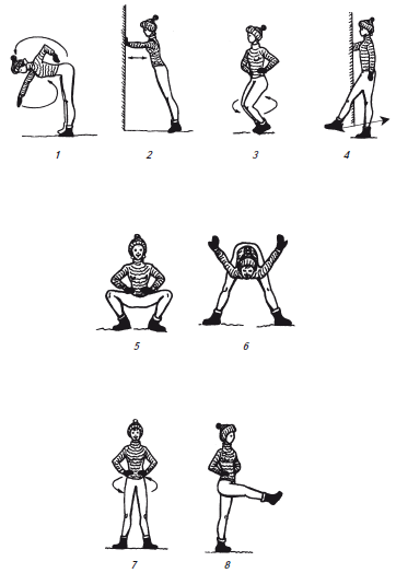 Перед каждой лыжной прогулкой обязательна 10-минутная разминка для подготовки организма к предстоящей физической нагрузке. Предлагаю следующий разминочный комплекс (рис. 80).