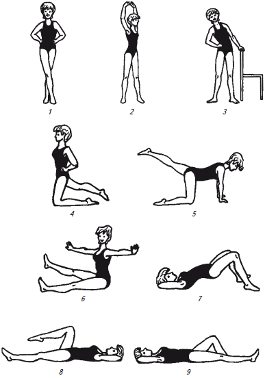Рис. 85. Примерный комплекс упражнений в третьем периоде беременности