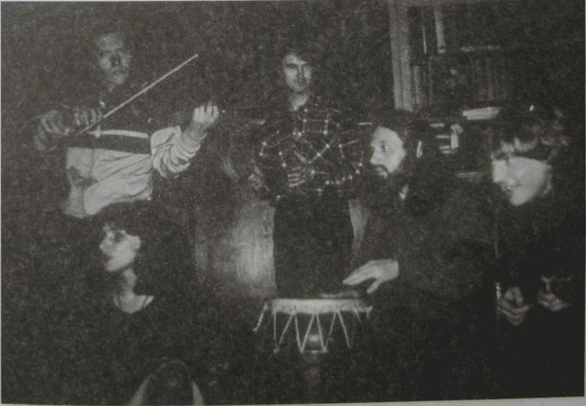 21. У Ирины Левшаковой (слева направо): Ирина Левшакова, со скрипкой Иван Воропаев, неизвестный, Всеволод Гаккель, Александр Башлачев. Ленинград, 1987