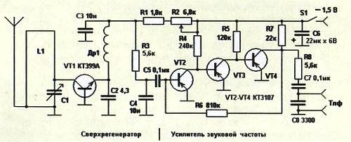 Продетектированный сигнал через цепочку R3C4, ослабляющую сверхзвуковую частоту суперизации, поступает на трехкаскадный УЗЧ, выполненный с непосредственной связью между транзисторами. Для повышения экономичности транзисторы работают в режиме микротоков, а выходной каскад нагружен на высокоомные телефоны с сопротивлением постоянному току 3,6–4,4 кОм.