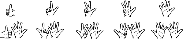 Китайцы действуют иначе (см. рис. ниже). Они используют комбинации и определенные положения пальцев — так они могут считать до десяти на пальцах одной руки. Лишь начиная с одиннадцати им нужна вторая рука. Тем самым они подключают оба полушария головного мозга только с числа «одиннадцать». Можно, конечно, предположить, что для абстрактного применения цифр в арифметике это не имеет никакого значения, особенно если учесть, что взрослые не используют пальцы для решения простых арифметических задач в пределах от одного до двадцати. Для этого пальцы никому не нужны.