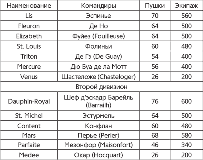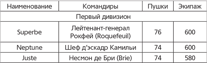 Состав французской эскадры – 13 линейных кораблей, 1 тяжелый и 2 легких фрегата.