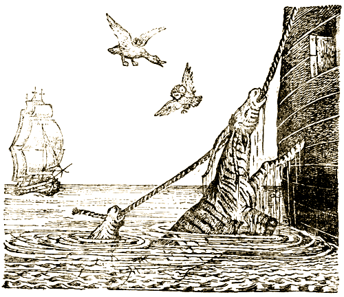 Доктор сейчас же направил свой корабль навстречу Крокодилу и Чичи и спустил им с корабля веревку. Они вскарабкались по веревке на палубу, кинулись к доктору и стали целовать его в губы, в щеки, в бороду, в глаза.
