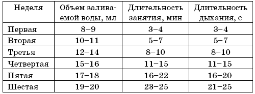 Стандартный режим (при вдохе и выдохе через рот) предполагает начинать занятия с 10—15 мин, постепенно увеличивая их и доводя до 36—40 мин. Время дыхательного акта на первых этапах не должно превышать 26—28 с, но постепенно его нужно увеличивать до 42—45 с. Объем заливаемой воды также постепенно прибавляется: 9–10 мл, 11—12 мл, 13—14 мл, 15—16 мл, 17—18 мл, 19—20 мл.