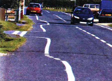 ХИТРАЯ РАЗМЕТКАприменяется на некоторых трассах Великобритании. Так, на дороге, проходящей через ряд деревень в графстве Хэмпшир, специально нанесены кривые линии разметки. Причем нарисованы они так хитро, что с водительского места создается впечатление неровностей дороги. И шоферы снижают скорость, например, перед переходом или автобусной остановкой.