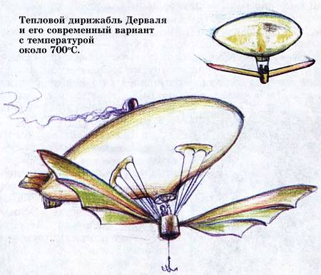 Отметим, что еще в 1880 г. с проектом аналогичного аэростата, только наполнявшегося не воздухом, а перегретым паром, выступил французский изобретатель А. Дерваль. Его аэростат также был снабжен крыльями. Он то поднимался, то опускался и при этом продвигался вперед.